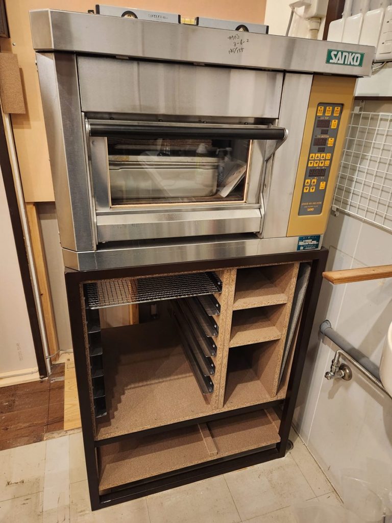 雑貨コーナーの裏側(厨房側)にはオーブンと自作のオーブンラックが収まっています。